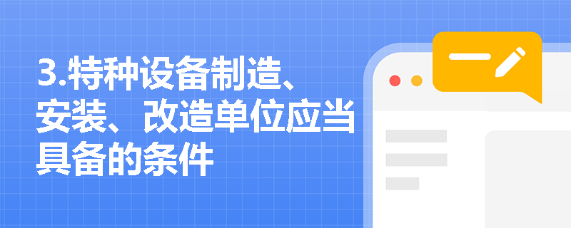 3.特种设备制造、安装、改造单位应当具备的条件(1)有与生产相适应的专业技术人员。(2)有与生产相适应的设备、设施和工作场所。(3)有健全的质量保证、安全管理和岗位责任等制度。(4)电梯的安装、改造、修理,必须由电梯制造单位或者其委托的依照本法取得 相应许可的单位进行。电梯制造单位委托其他单位进行电梯安装、改造、修理的,应当对其安装、改造、修理进行安全指导和监控,并按照安全技术规范的要求进行校验和调试。电梯制造单位对电梯安全性能负责。