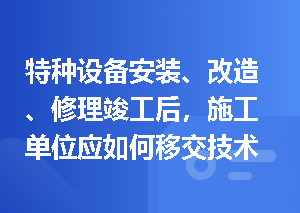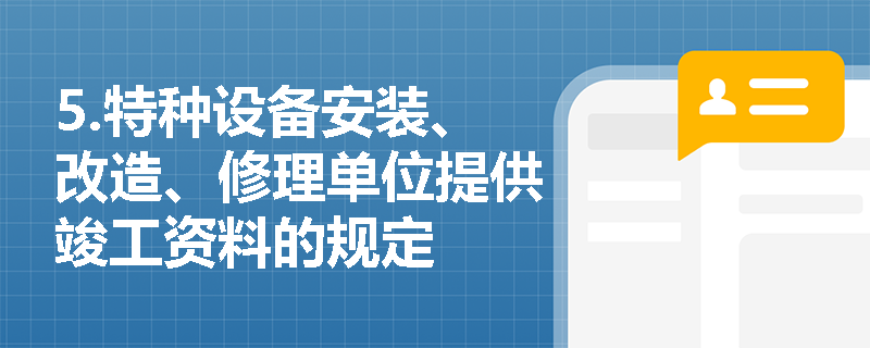 5.特种设备安装、改造、修理单位提供竣工资料的规定(1)特种设备安装、改造、修理竣工后,安装、改造、修理的施工单位应当在验收后30日内将相关技术资料和文件移交特种设备使用单位特种设备使用单位应当将其存入该特种设备的安全技术档案。